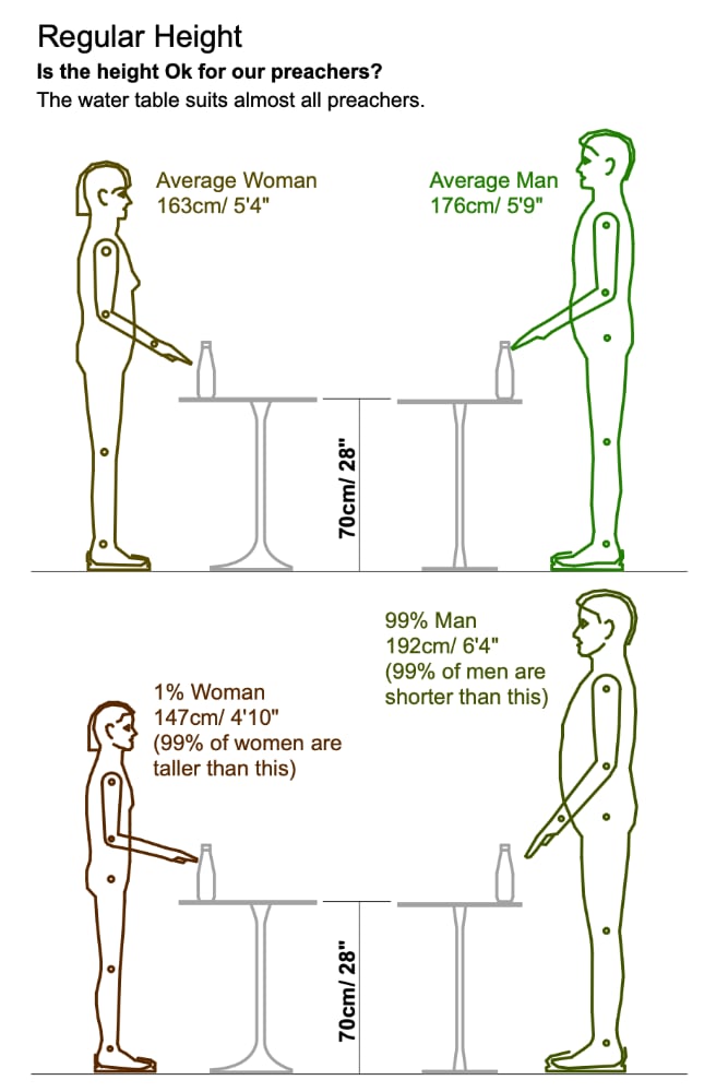 This table is designed to suit the Arc2 podium. It is to be used for a water glass, jug, laptop computer and other resources like books and CD’s. This table is 28" (70cm) high rather than a normal coffee table which is 18" (44cm) high. This means that items are within easy reach of the preacher, without being so high that items are distracting. It is made from stainless steel with a clear perspex top. This table is often used for television broadcasts. In this case, an anti glare film is applied to the top to eliminate glare.More about this church furniture Arc water table: