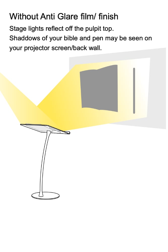 Anti reflective film is not available for this lectern. Anti reflective film is needed if you have a projector screen behind the preacher. For more information on anti reflective film, click here.